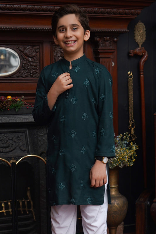 DARK GREEN EMBROIDED KID'S KURTA