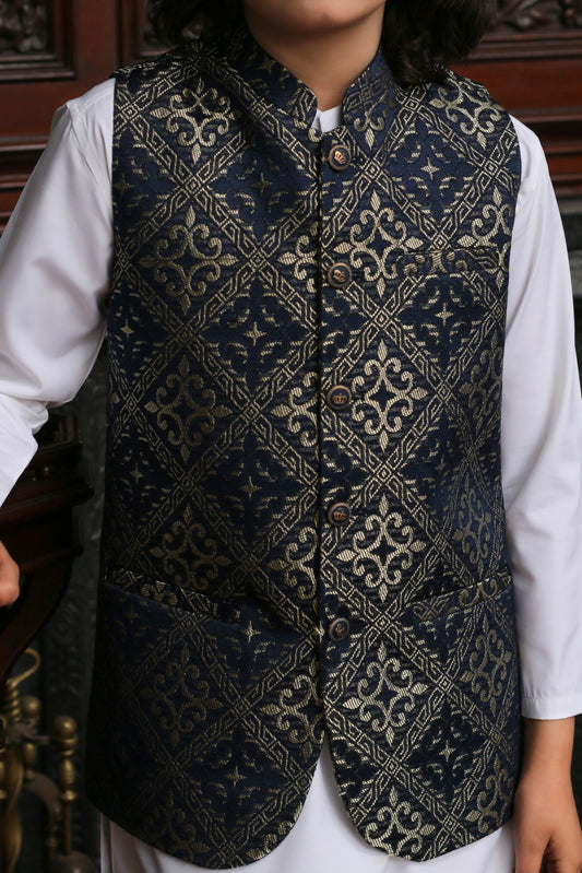 CHARCOAL BLUE EMBROIDED JAMAWAR KID'S WAIST COAT
