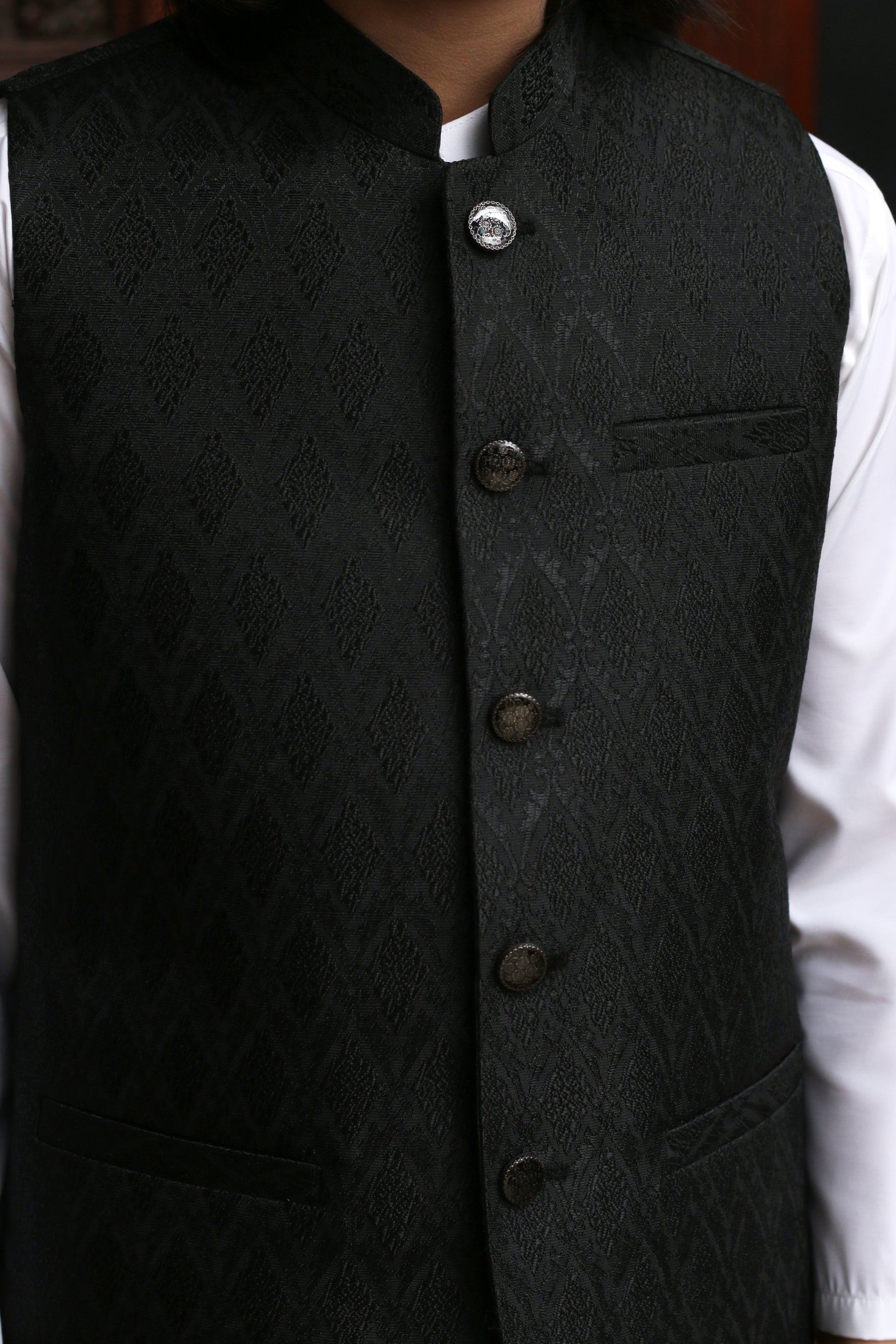 Indulge your little one in luxury with our Black Jamawar Kid's Waist Coat. Made from exquisite Jamawar material and designed in a bann style, this eastern waist coat exudes sophistication. Perfect for all seasons and ceremonial occasions, elevate your child's style with this elegant piece.