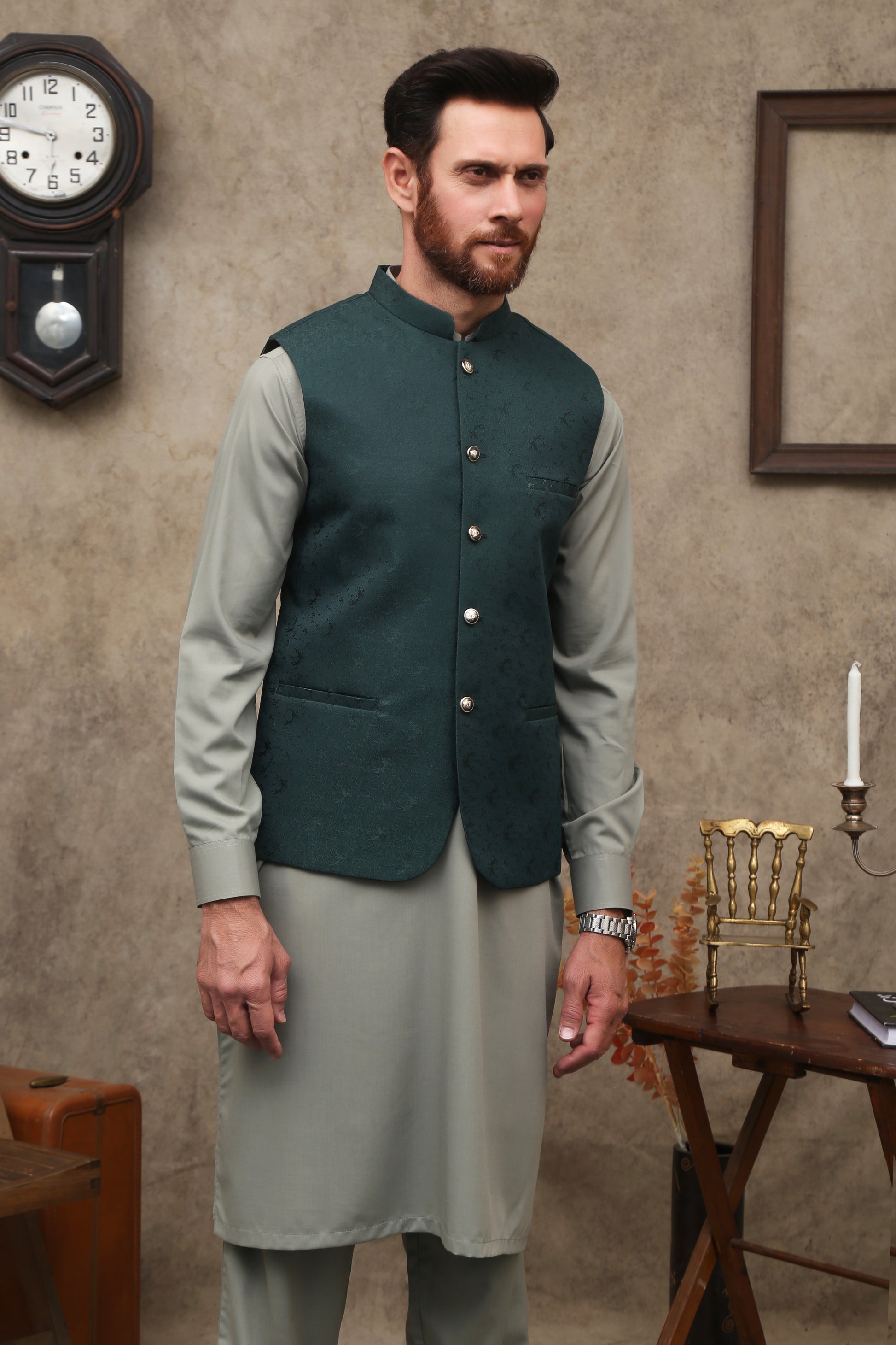 Made with elegant jamawar fabric, this waist coat adds a touch of sophistication to formal attire. Its self-textured design is both elegant and eye-catching, and complements the very attractive color perfectly. Elevate your formal look with this elegant and stylish waistcoat.