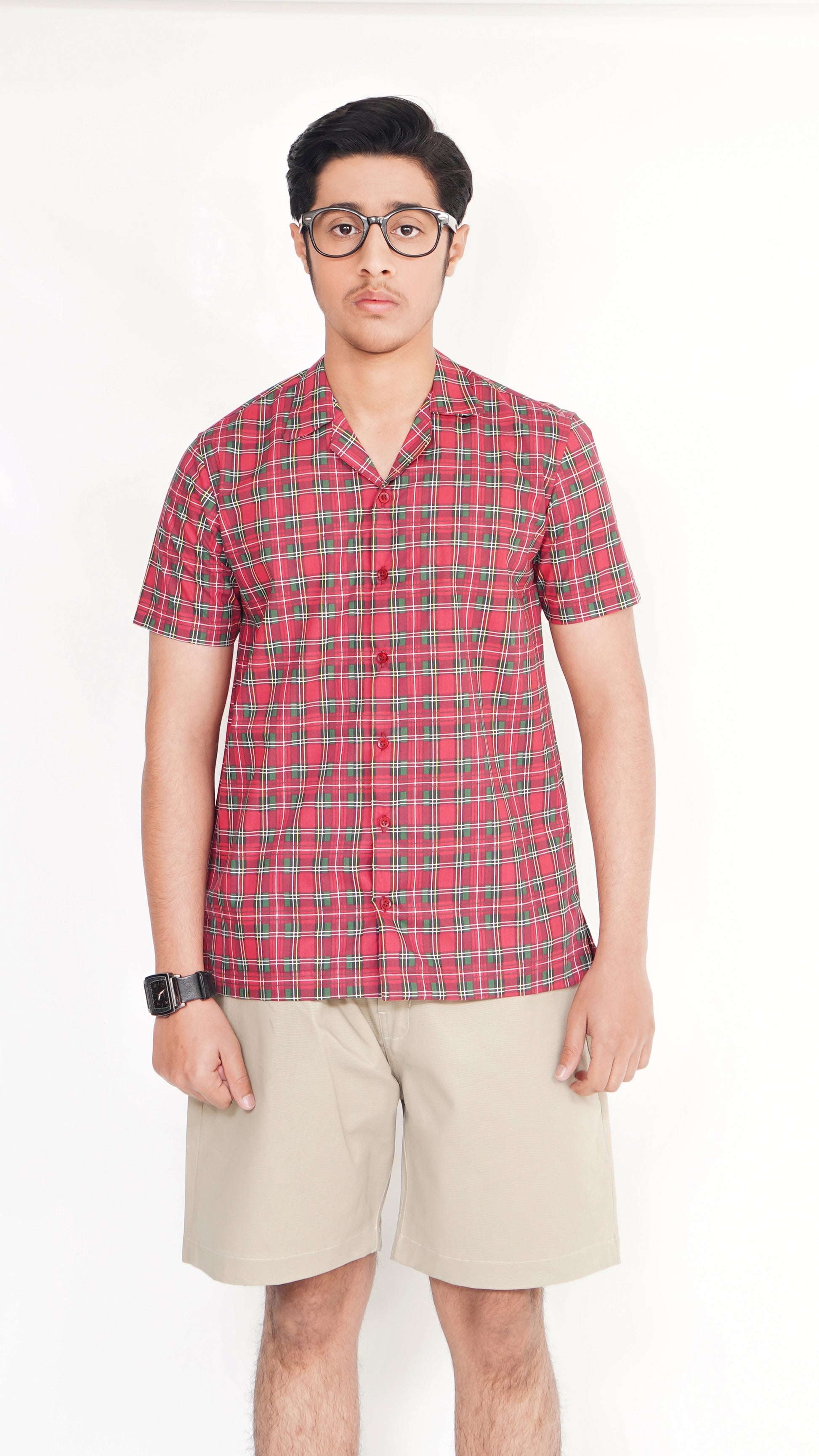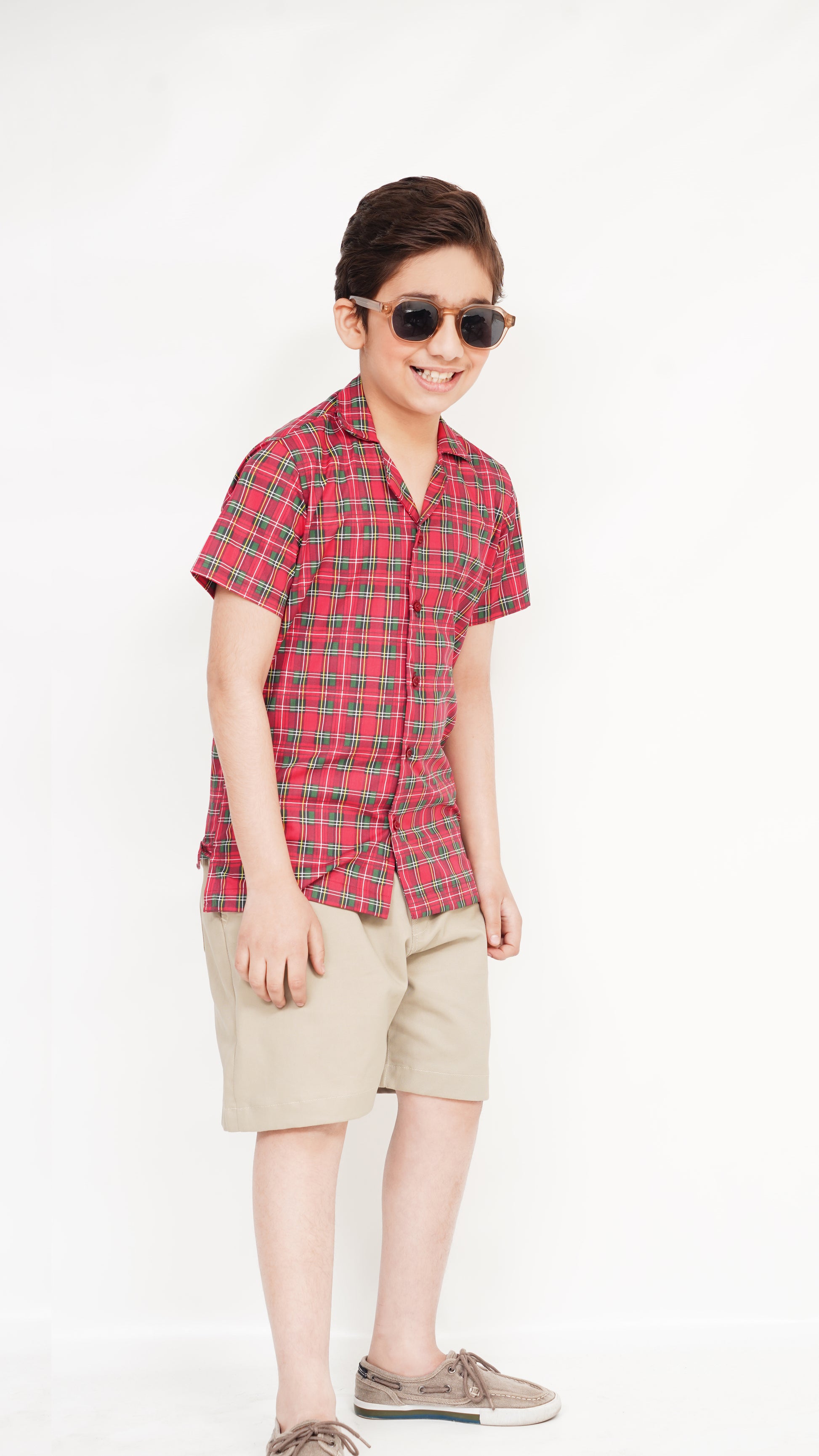 This kids' set includes a red print cotton beach shirt paired with a stretchable twill fabric neeker, designed for casual wear. The breathable cotton shirt offers comfort and style, while the flexible twill neeker ensures ease of movement. Together, they provide a practical and fashionable outfit perfect for everyday activities.