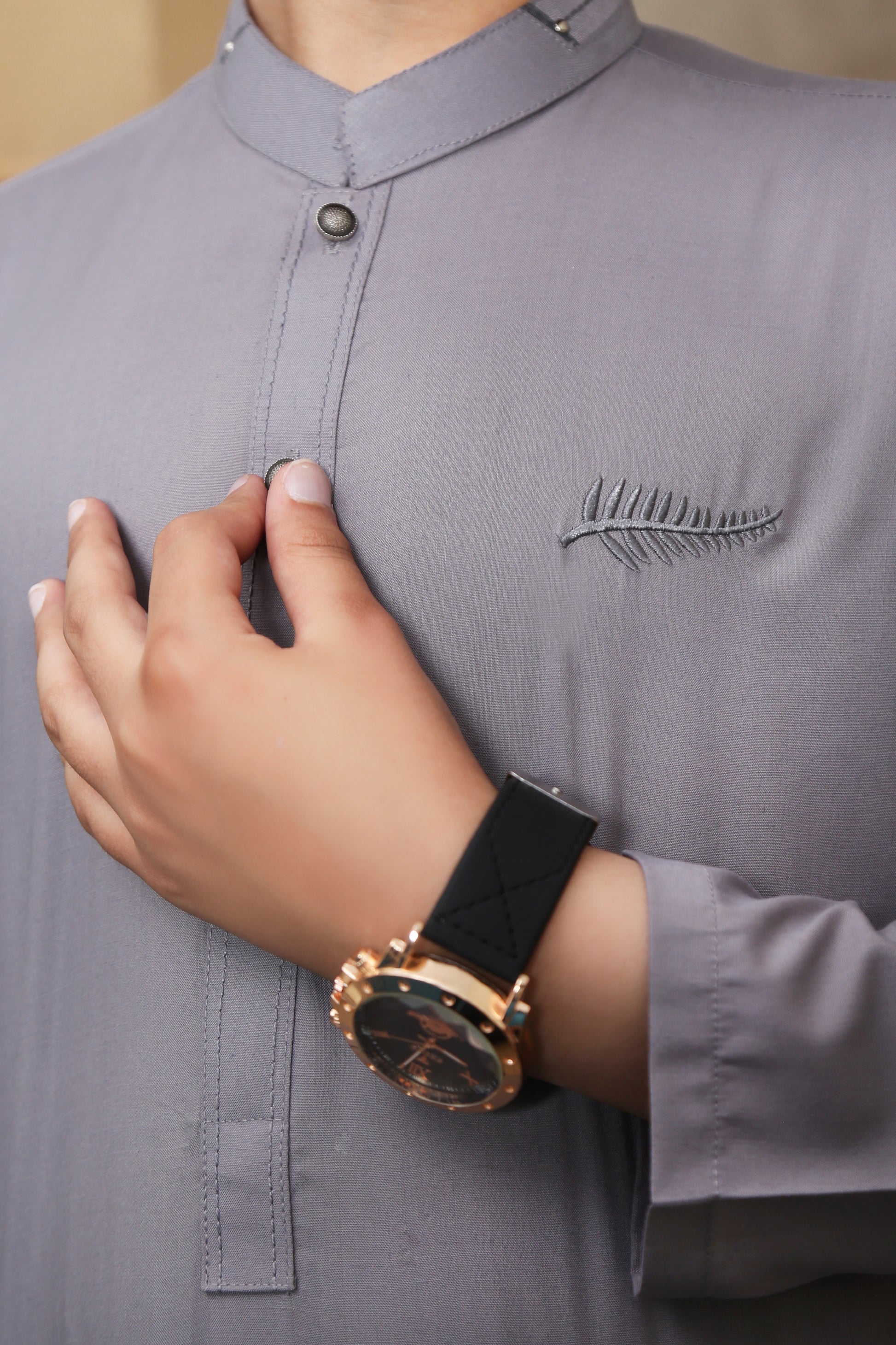 This kid's shalwar kameez is made from durable wash'n wear fabric with strong contrast fabric and thread work on Bann. Perfect for casual wear or special functions. Dress your child in comfort and style with this light grey ensemble.