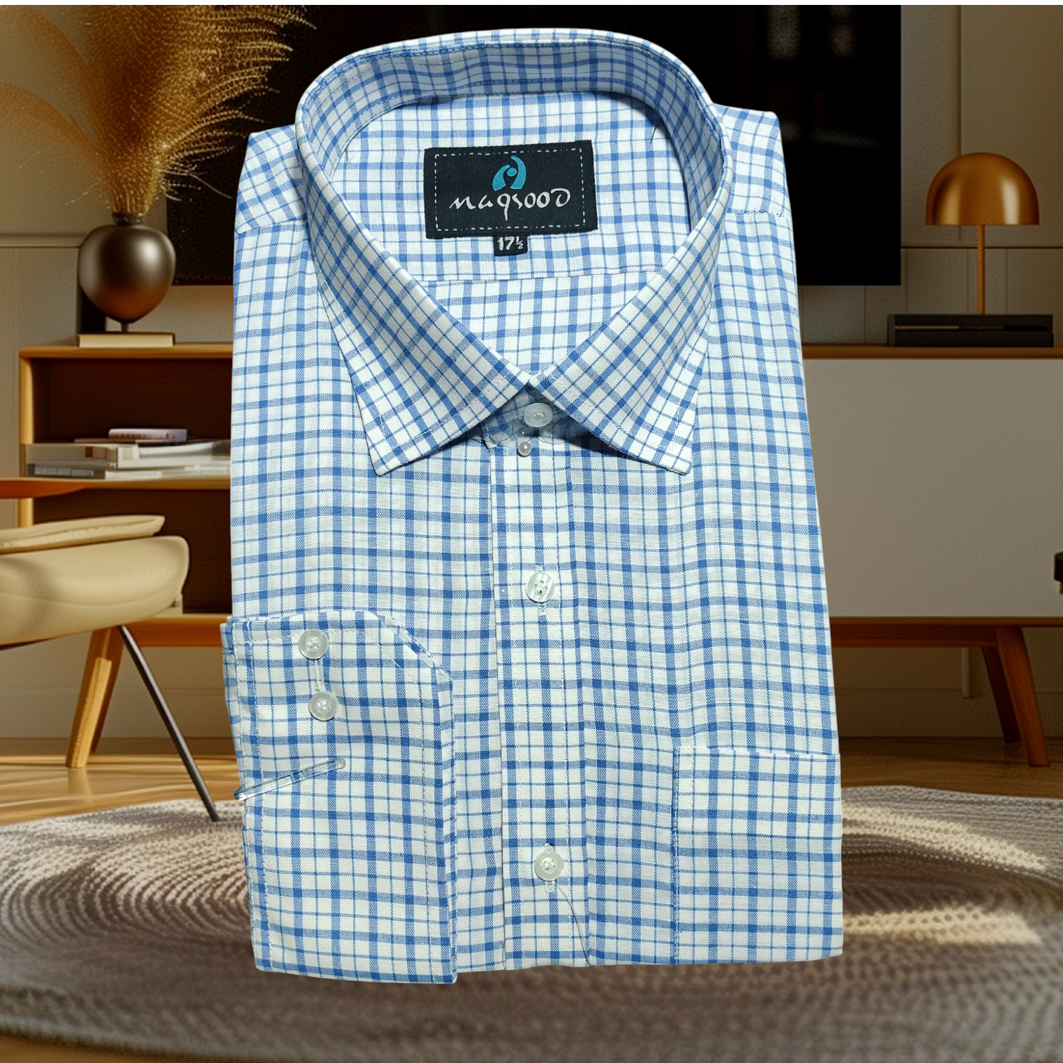 MEN'S BLUE WHITE CHECK DRESS SHIRT