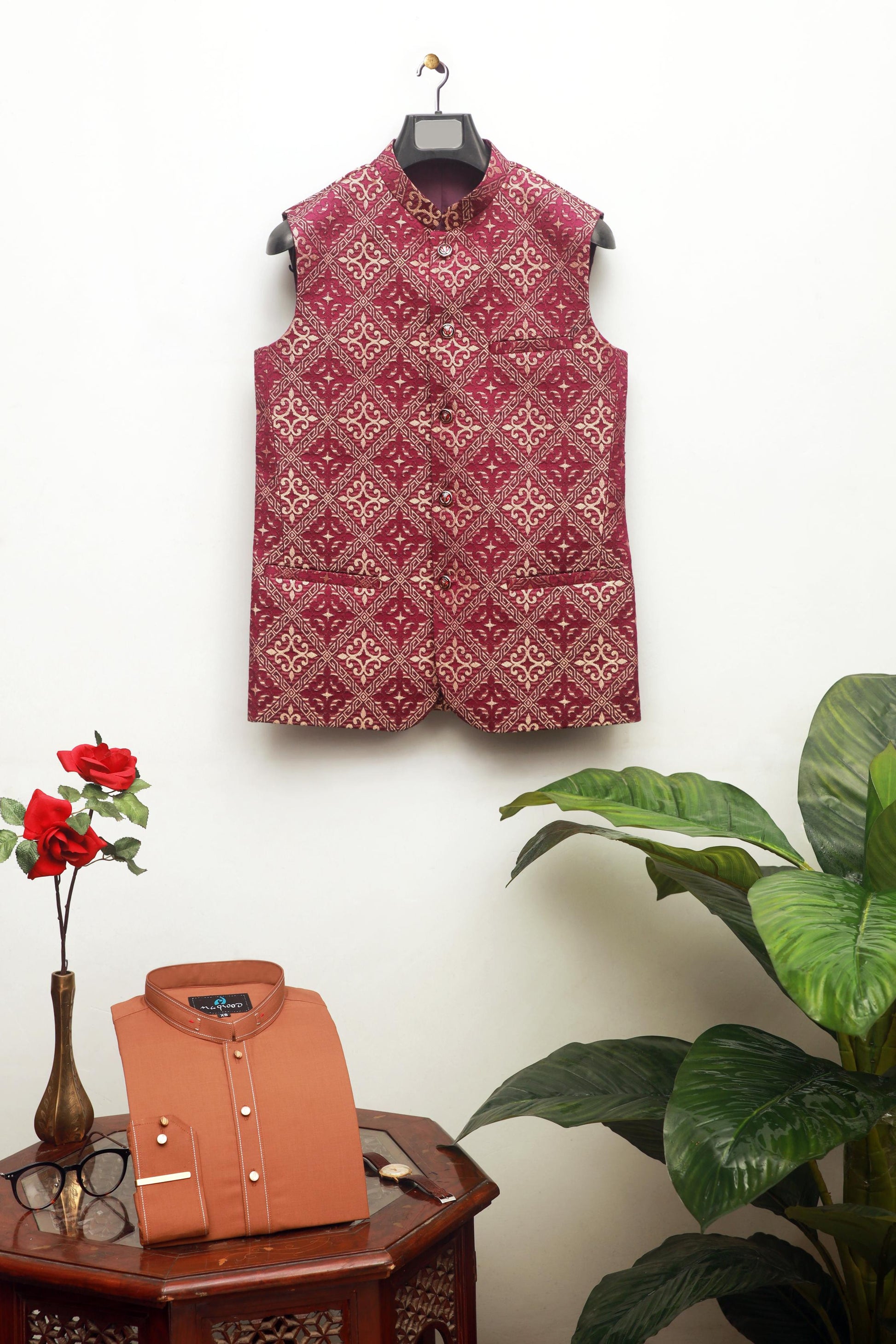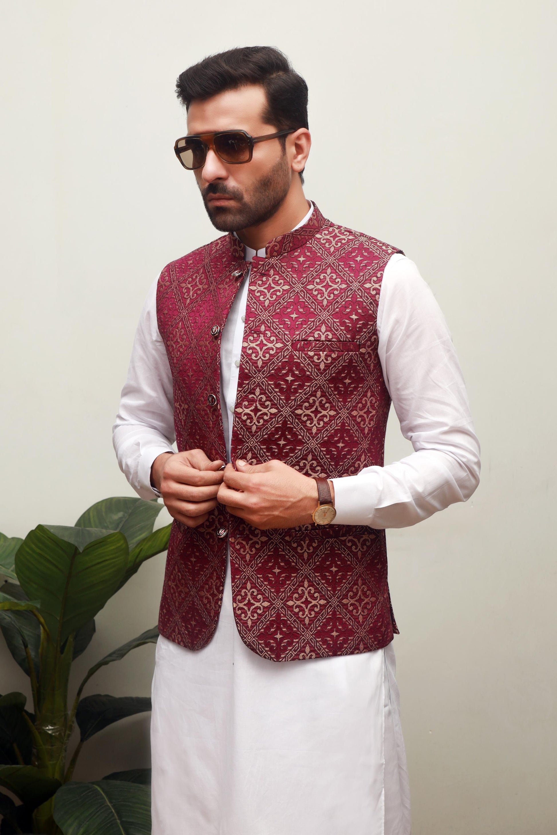 Expertly crafted from luxurious jamawar fabric, this men's waist coat is a stunning addition to any formal occasion. With a beautiful color and intricate embroidery, it is sure to make a statement. Perfect for any special function, this waist coat exudes sophistication and elegance.